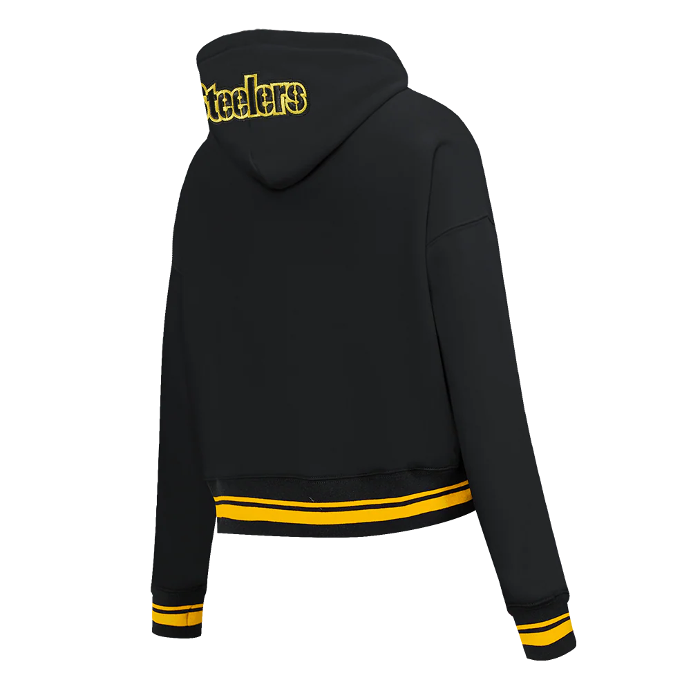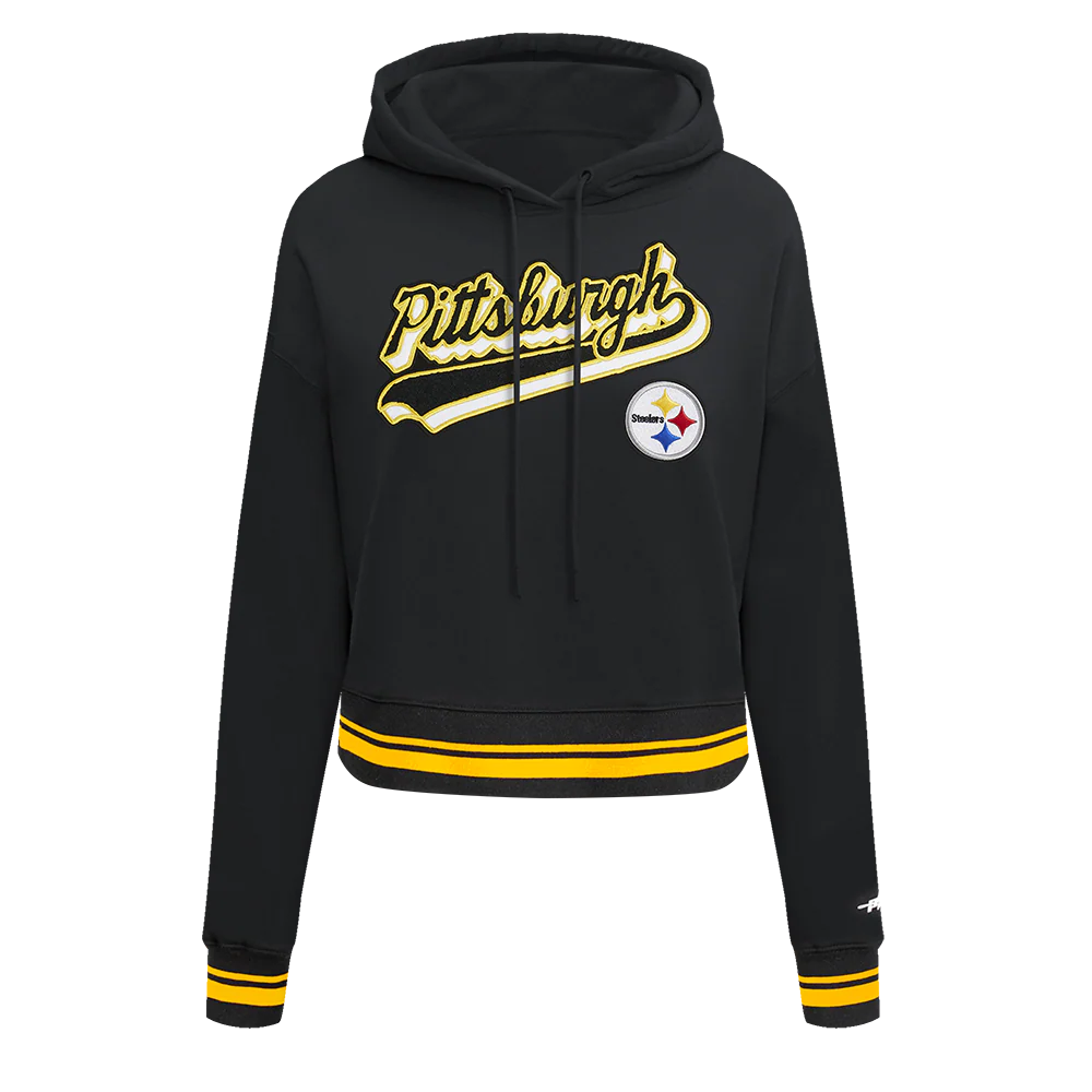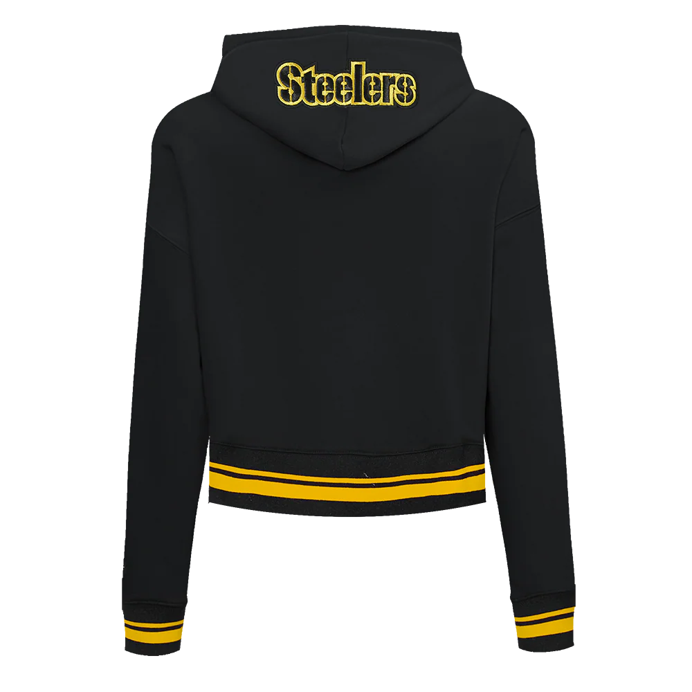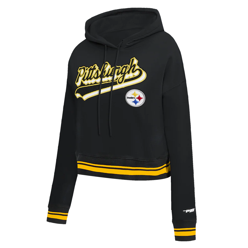 PITTSBURGH STEELERS PRO STANDARD SCRIPT TAIL WOMEN’S RIB FLC CROPPED PO HOODIE BLK